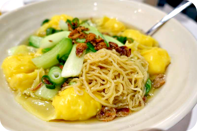 Thin egg noodles, prawn dumplings and vegetables in a clear chicken broth